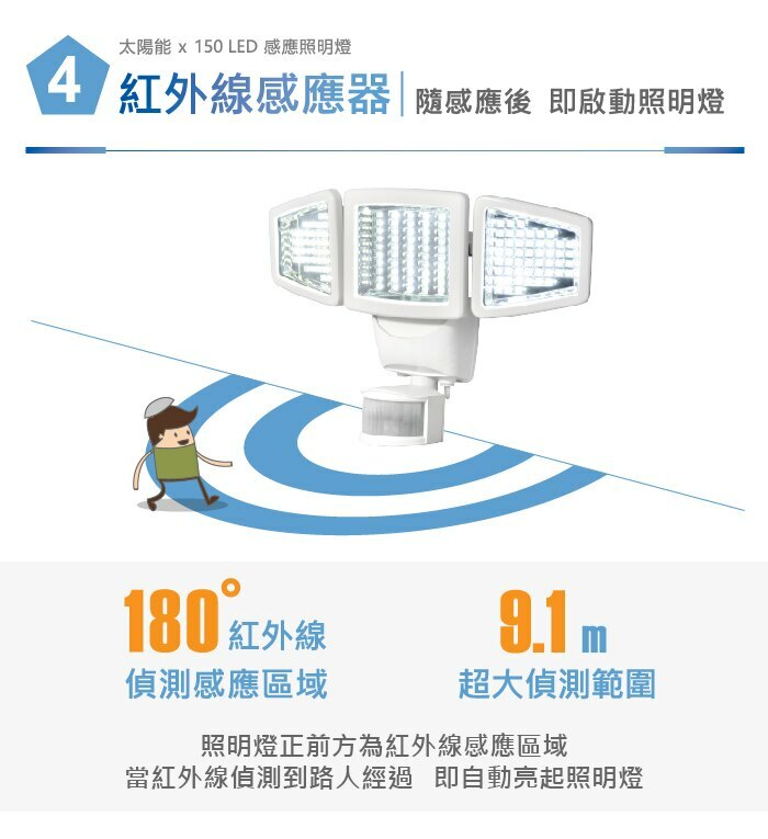 ★採用紅外線感應器,可180度全方位偵測,並適時提供照明需求。