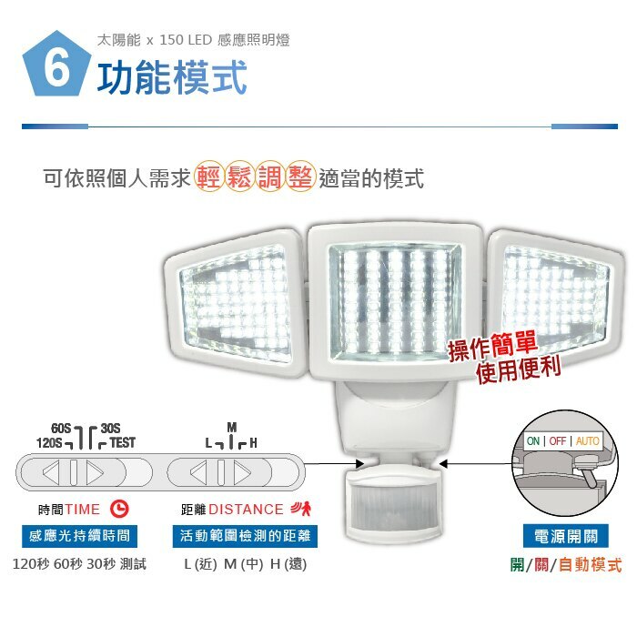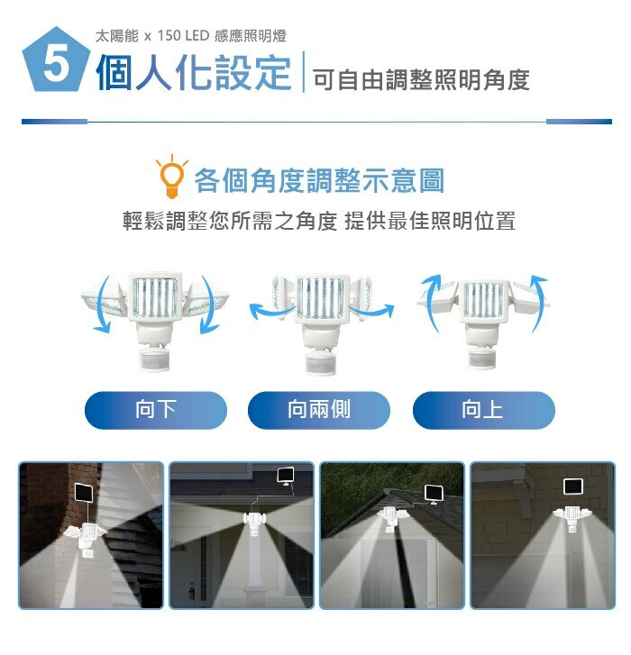 ★可依照個人化需求進行調整照明角度、偵測距離範圍以及照明光的延續時間。