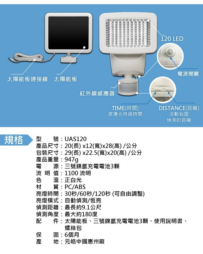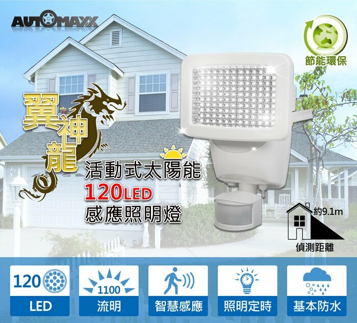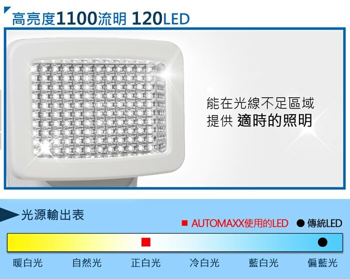 ★使用120LED/1100流明的感應照明燈,能在光線不足的區域提供照明。
