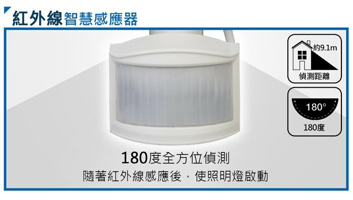 ★ 採用紅外線感應器,可180度全方位偵測,並適時提供照明需求。
