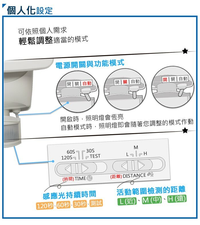 ★可依照個人化需求進行調整照明角度、偵測距離範圍以及照明光的延續時間。