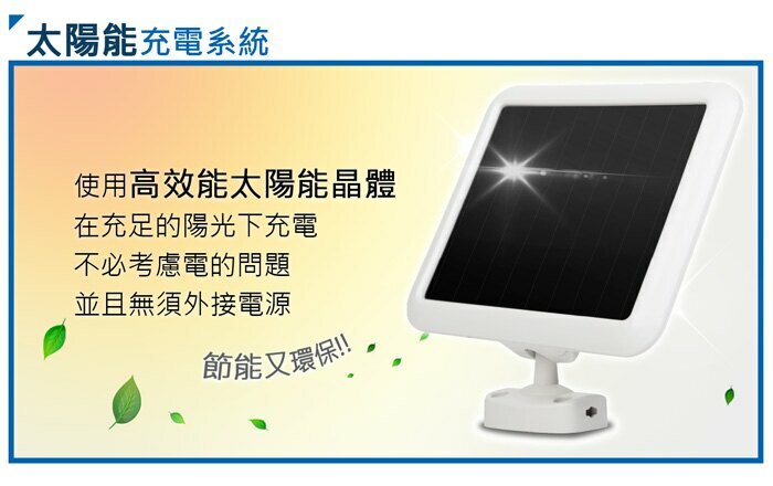 ★響應綠色環保,使用太陽能發電技術提供產品蓄電,無須額外接電。