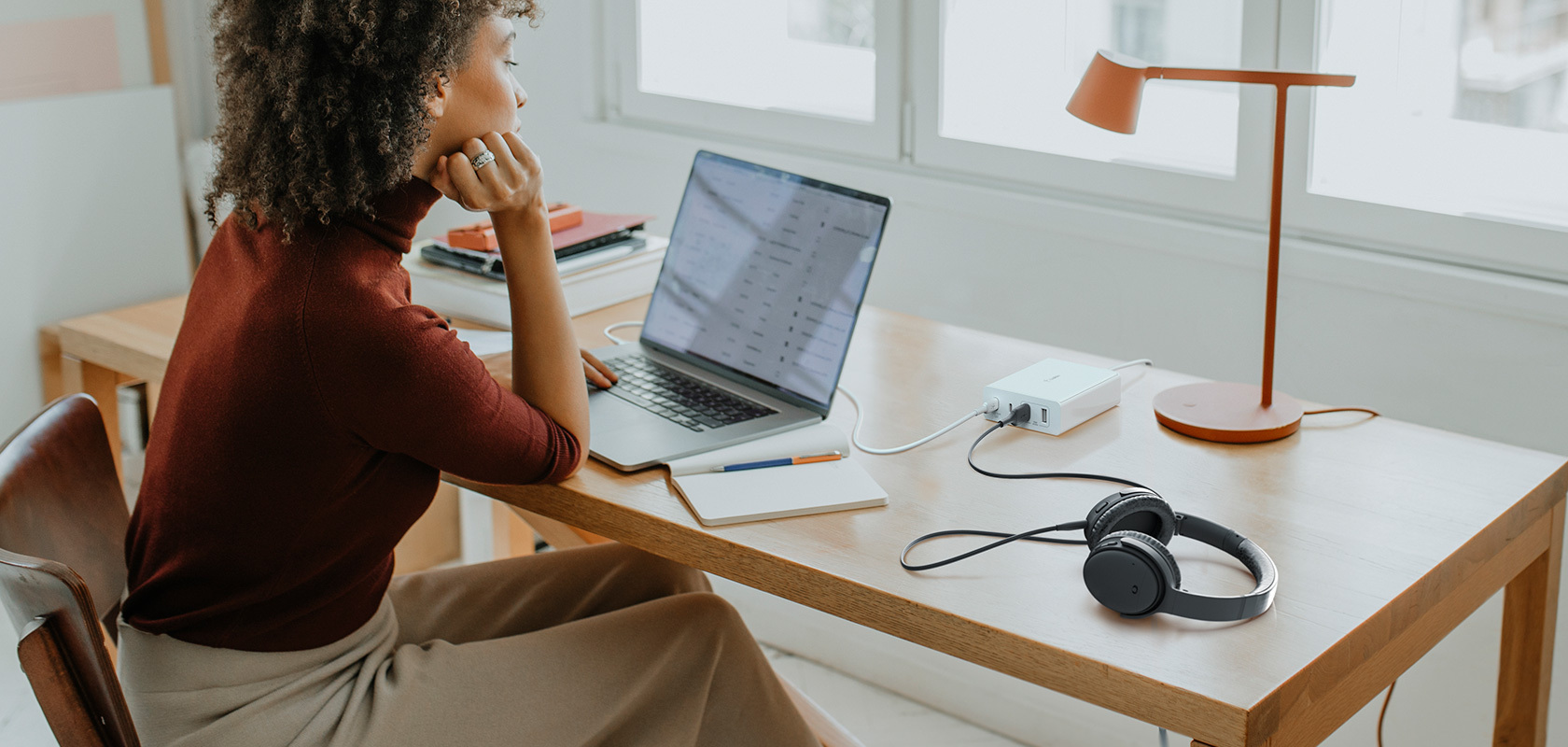 使用我們的 108W 4 埠 GaN 充電器,透過充電器上的 2 個USB-C® 與 2 個 USB-A 連接埠為手提電腦及另外 3 部裝置充電。配備 USB-C PD、GaN 等技術,實現高能高效充電。專為坐在桌旁充電而設計,方便接達連接埠。
