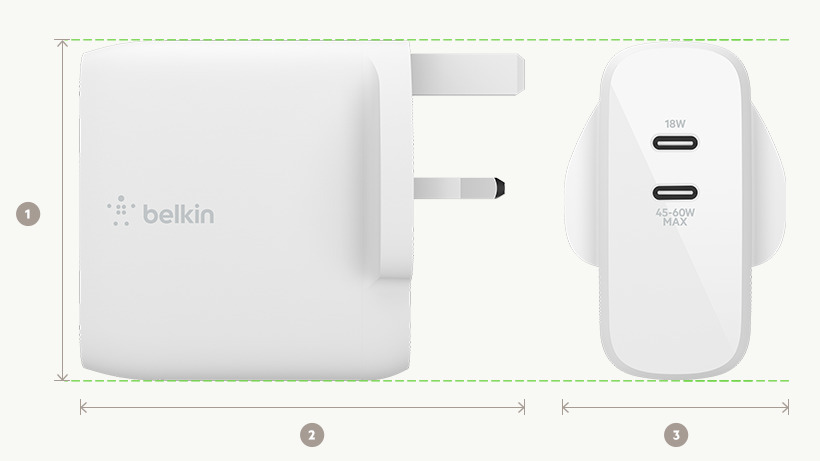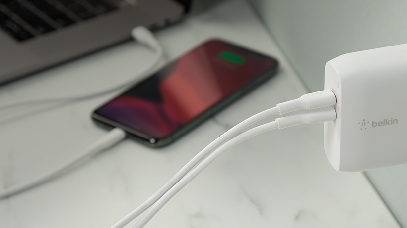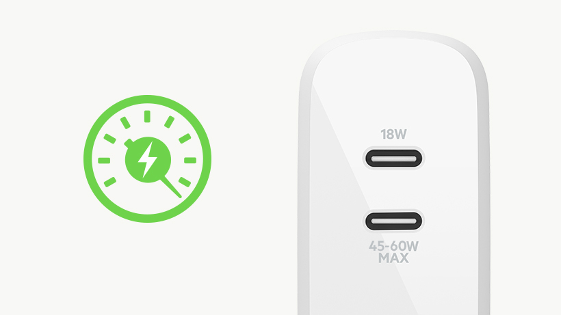 透過每個 USB-C 連接埠為裝置提供適當的電源。智能電源共用可以感知每個連接埠的使用時間並相應導出最佳功率,可為一部大型裝置或任何兩部裝置提供最佳的充電效能。您可以使用一個連接埠為一部 USB-C 裝置充電,最高可獲得 60W 的功率;也可以用一個連接埠以 45W 為手提電腦或平板電腦充電,而用另一個連接埠以 18W為智能手機充電。