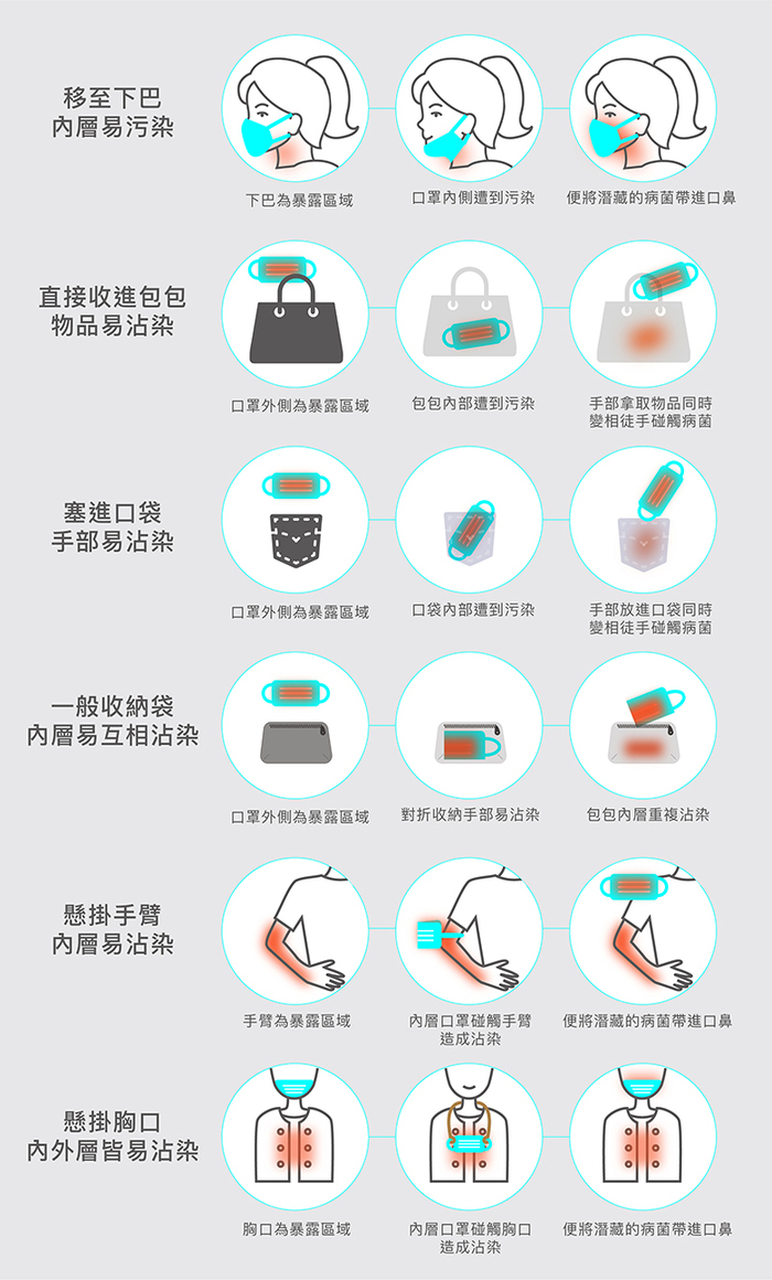 最怕的就是口罩外層的髒污沾到別的地方,反而造成二次污染。