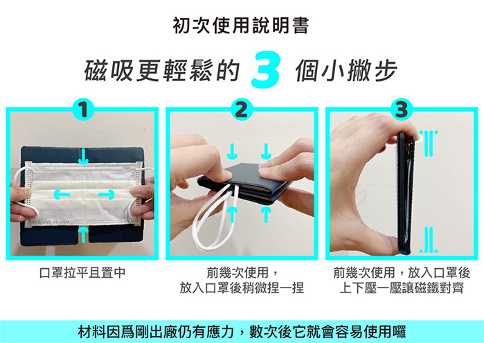 •若是使用立體醫療口罩,有可能會超出DABO.U磁吸口罩皮夾的包覆範圍,且磁吸功能無法使用唷。