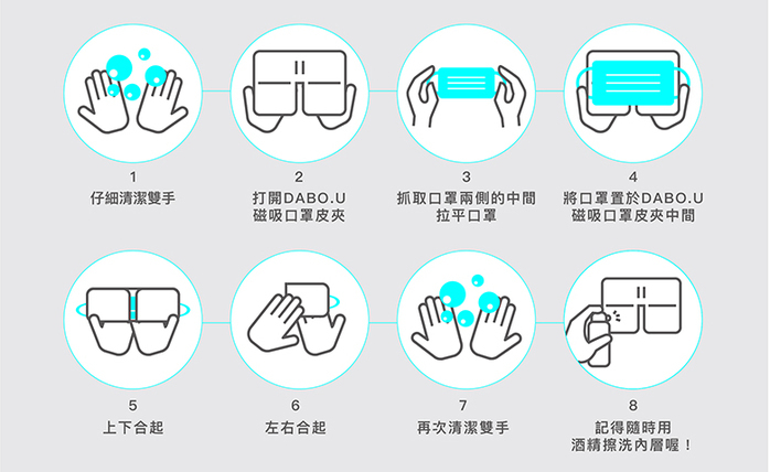 為了達到俐落收納的目的,我們使用了十六顆迷你磁鐵,只要四個簡易的步驟就可以俐落將口罩收起。