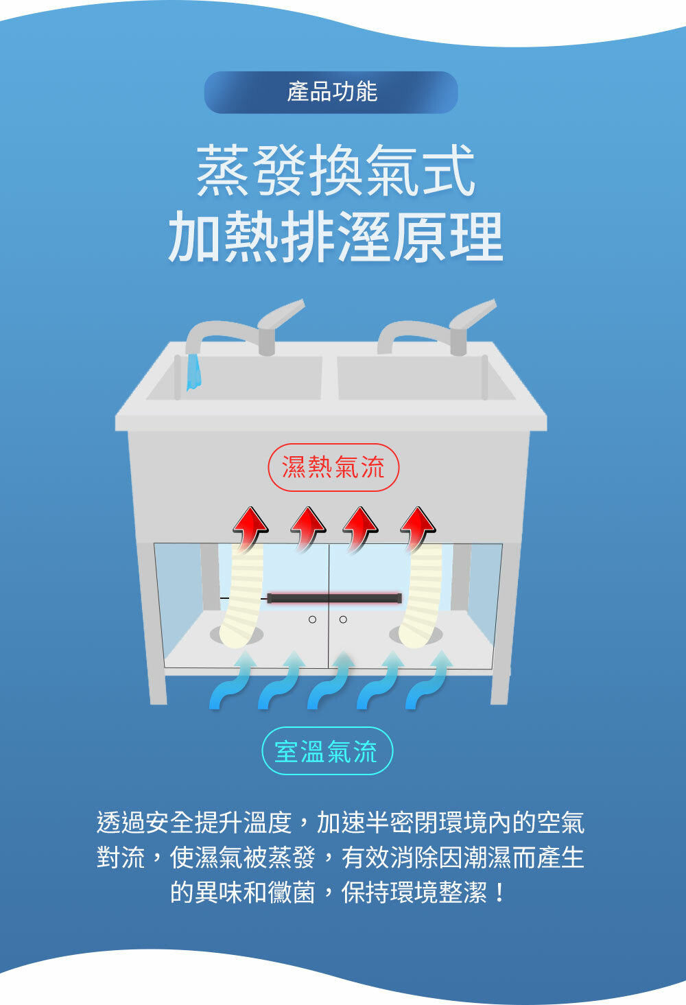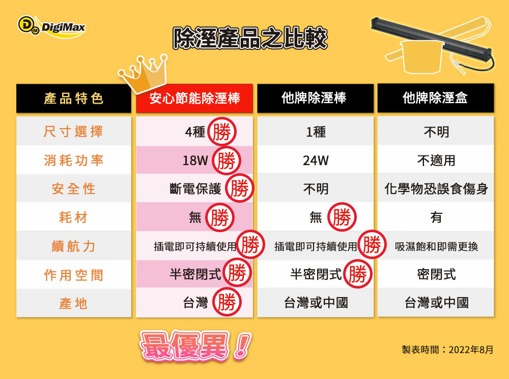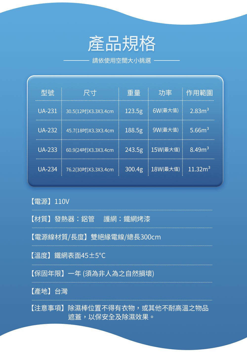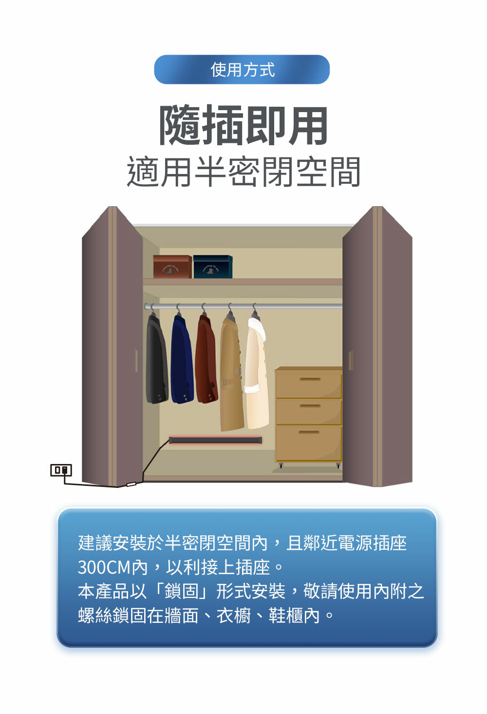 ● 注意事項:除濕棒位置不得有衣物,或其他不耐高溫之物品遮蓋,以保安全及除濕效果。