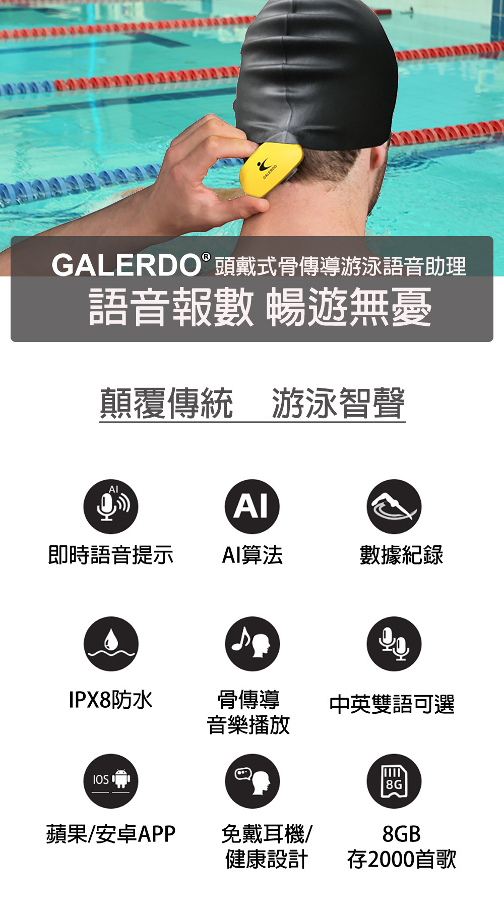 內建游泳動態傳感器,紀錄你游泳的每一刻,搭配人工智能游泳演算法與骨傳導聲學科技,激勵你每一次游泳計畫,台灣人工智能黑科技,徹底改變你對游泳枯燥無聊的感覺。