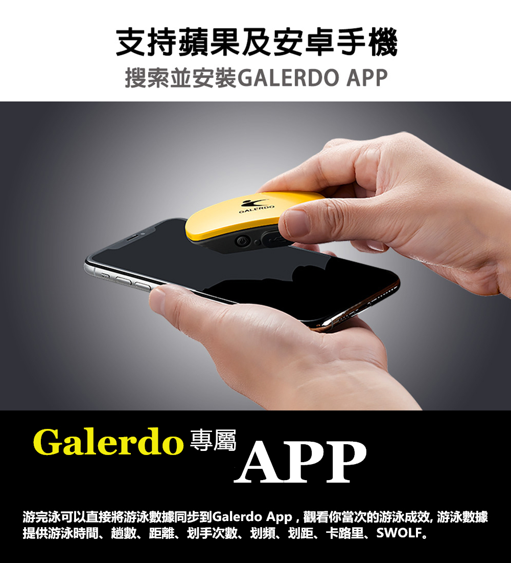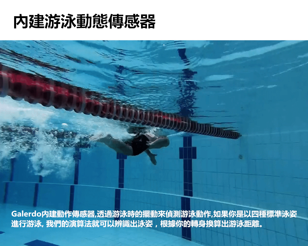 Galerdo內建動作傳感器,透過游泳時頭部的擺動來偵測游泳動作,如果你是以四種標準泳姿進行游泳, 我們的游泳演算法就可以辨識出泳姿,根據你的轉身換算出游泳距離。