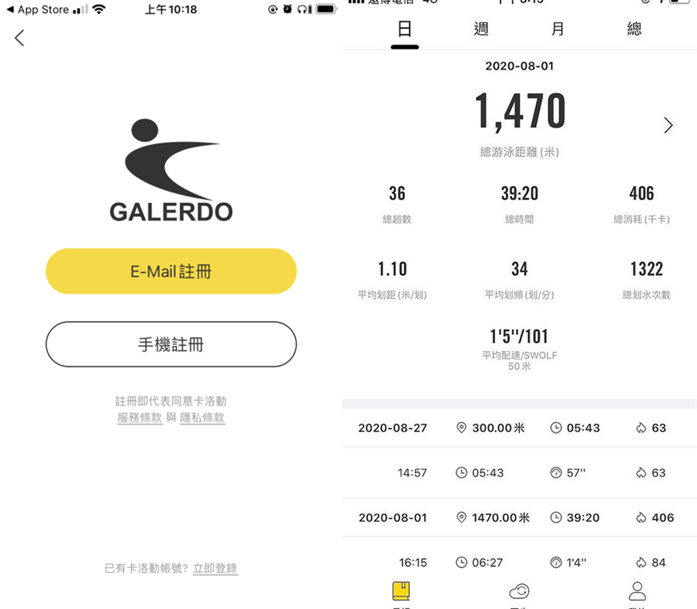游完泳可以直接將游泳數據同步到Galerdo App , 觀看你當次的游泳成效, 游泳數據支持游泳時間、趟數、距離、划手次數、划頻、划距、卡路里、SWOLF。