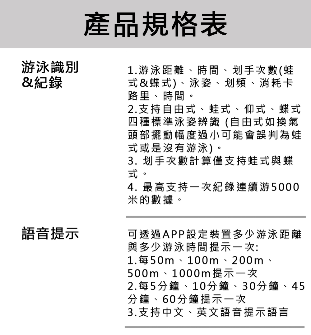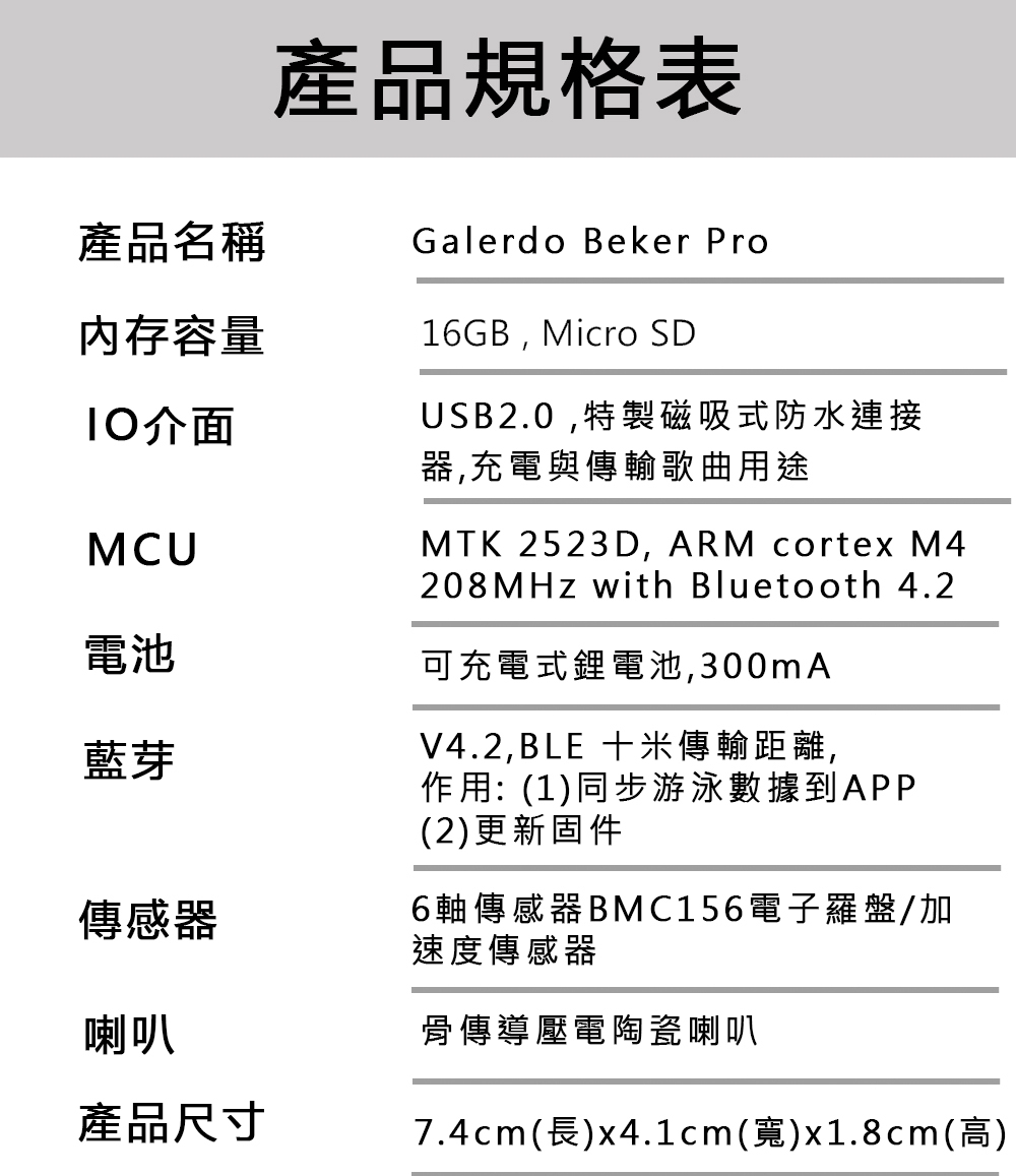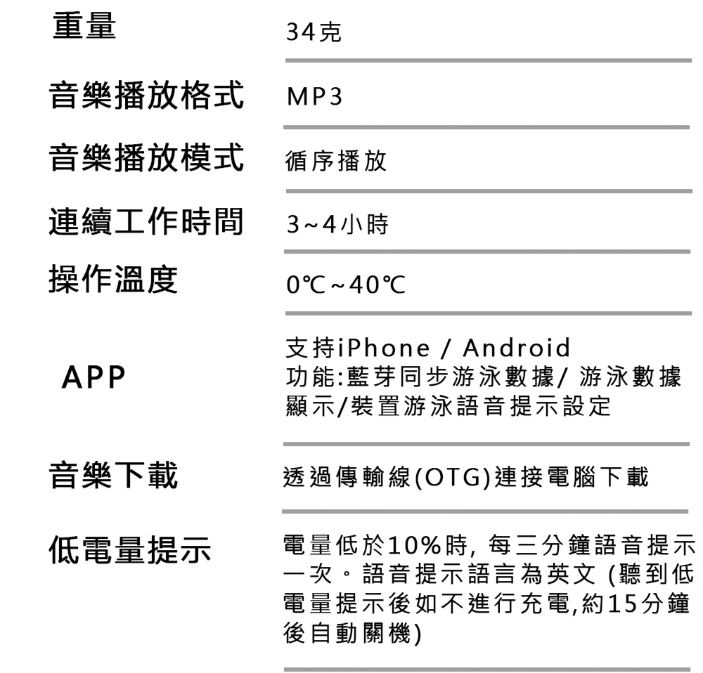 藍芽版本:V4.2 (APP游泳動態數據使用,不可傳輸音樂)