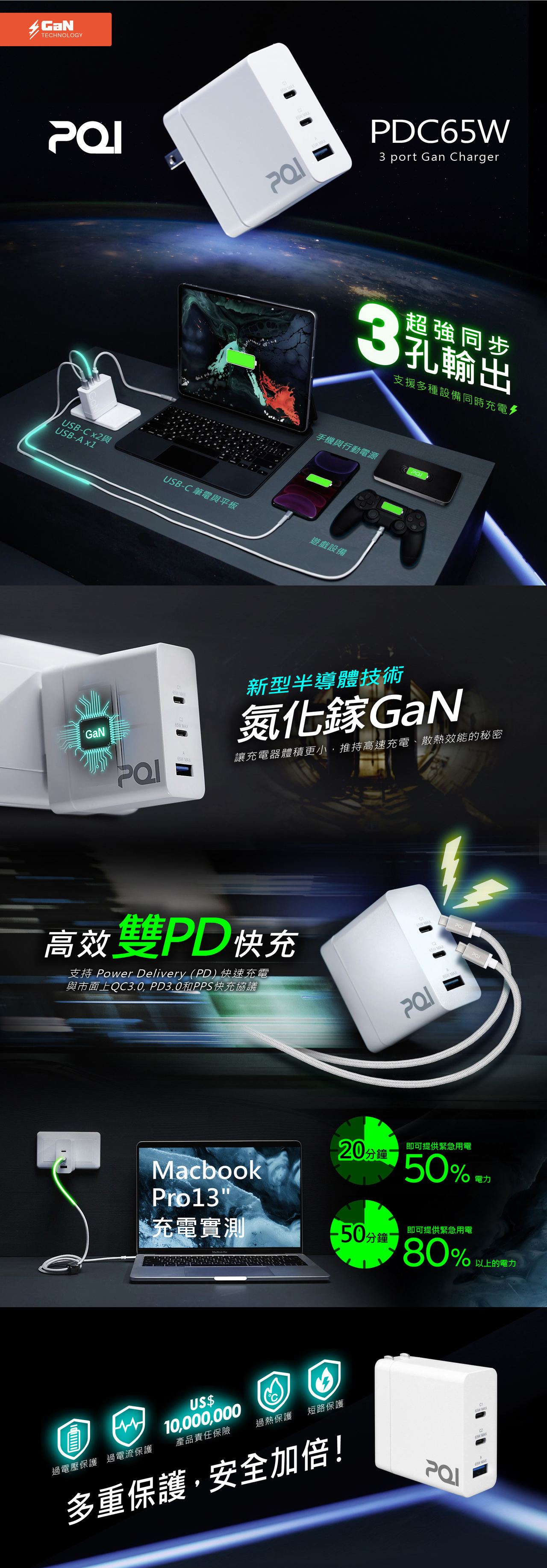 USB-C單孔最大輸出最高可達65W,USB-A也可達60W,可支援市面上各大廠牌的充電協議。