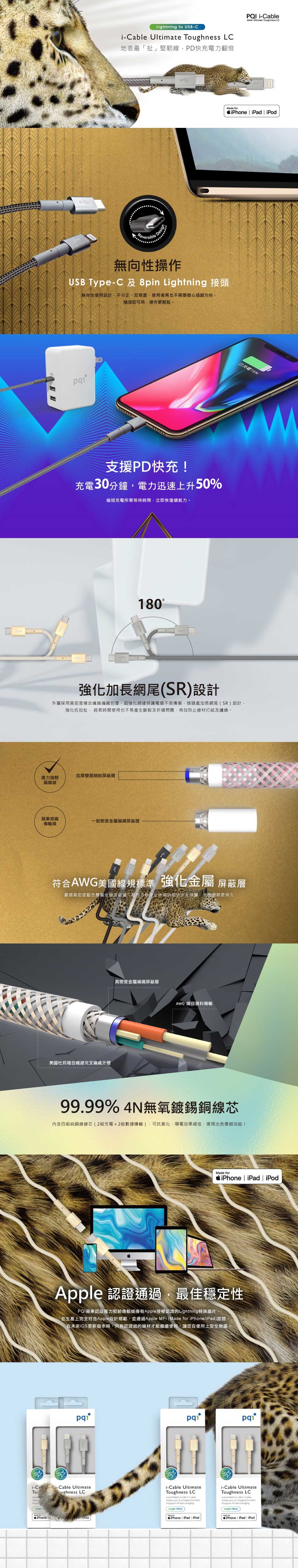PQI i-Cable Ultimate Toughness LC MFI快充金屬編織線 100cm