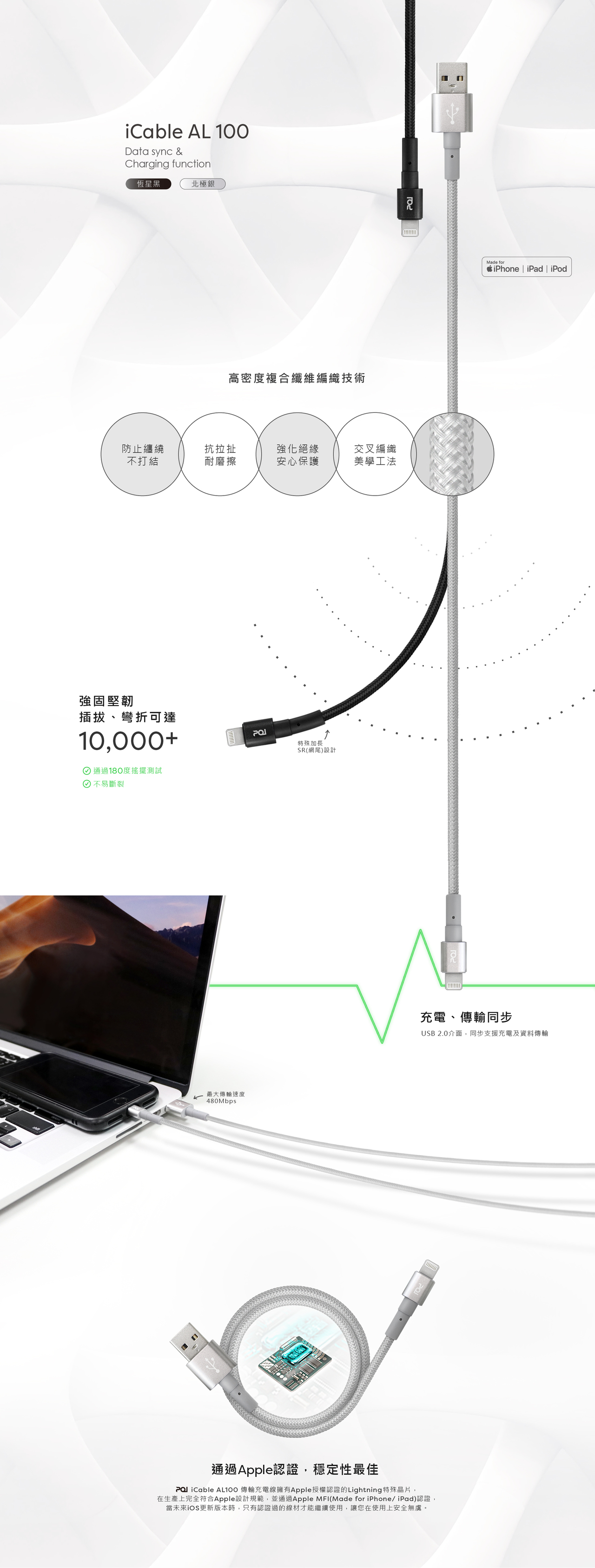PQI iCable AL 100MFI認證傳輸充電線, 擁有 USB A 及 Lightning 傳輸接頭,