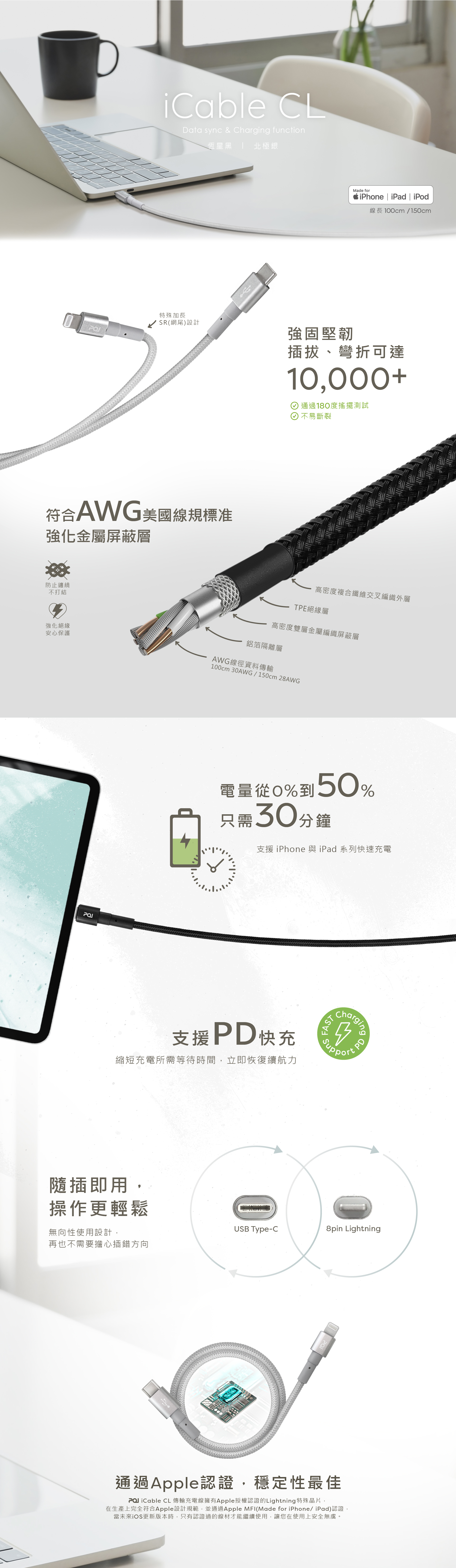 PQI iCable CL 100 蘋果認証傳輸充電線, 採用 USB Type-C 及 Lightning 傳輸接頭,以高密度複合纖維編織,線身強韌不易打結。