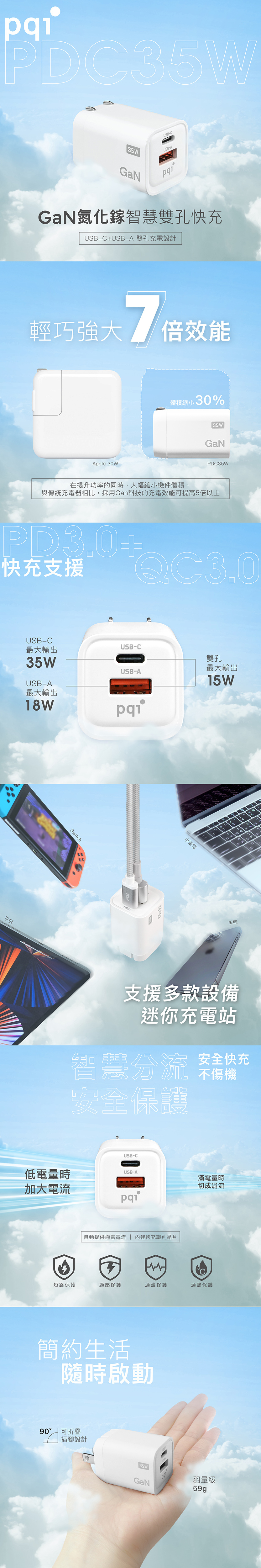 智慧雙孔快充:USB-C孔最大輸出為35W,USB-A孔最大輸出為18W