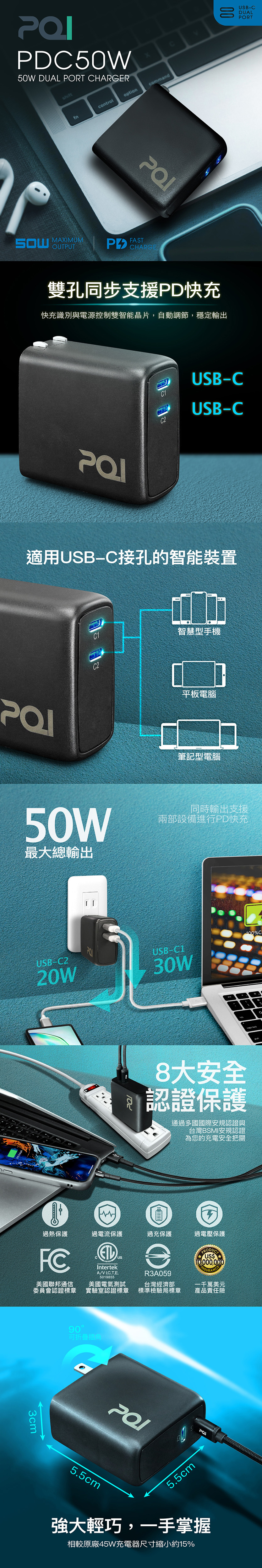 USB-C1or USB-C 2 : 5V3A/9V3A/12V3A/15V3A/20V2.5A ( 最大輸出 : 50W)
