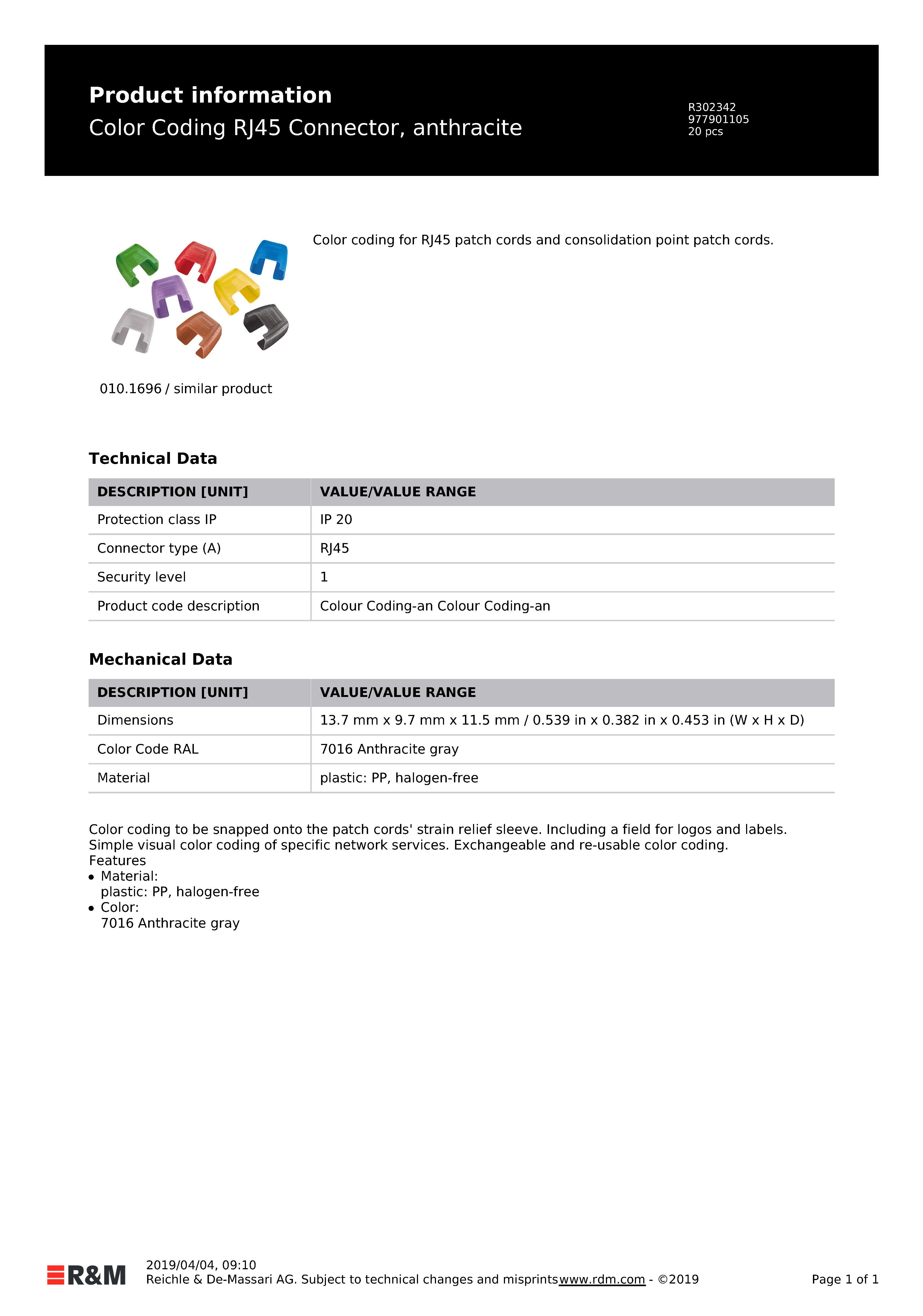 R&M CAT.6A 分類 色彩編碼RJ45連接器(衣)