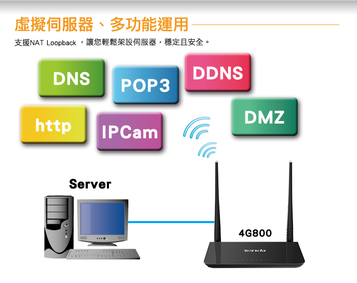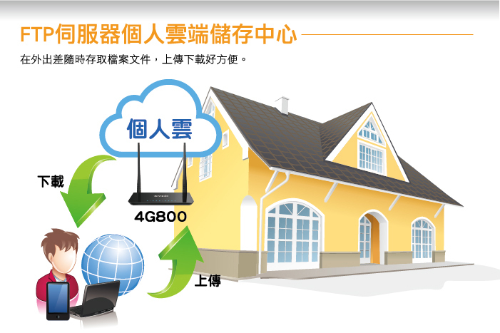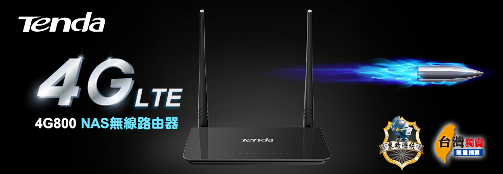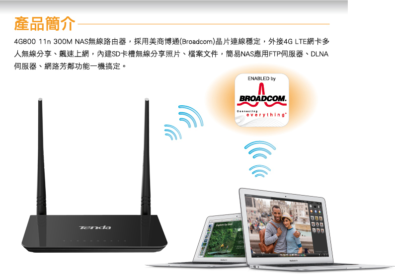 4G800 11n 300M LTE無線路由器,採用美商博通(Broadcom)晶片連線穩定,外接USB dongle 4G LTE網卡多人無線分享、飆速上網,內建SD卡槽無線分享照片、檔案文件,簡易NAS應用FTP伺服器、DLNA伺服器、網路芳鄰功能一機搞定。