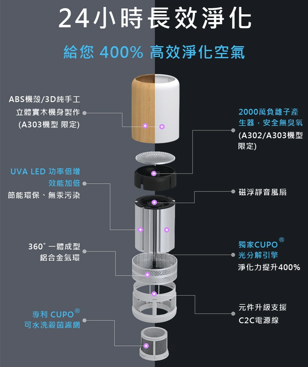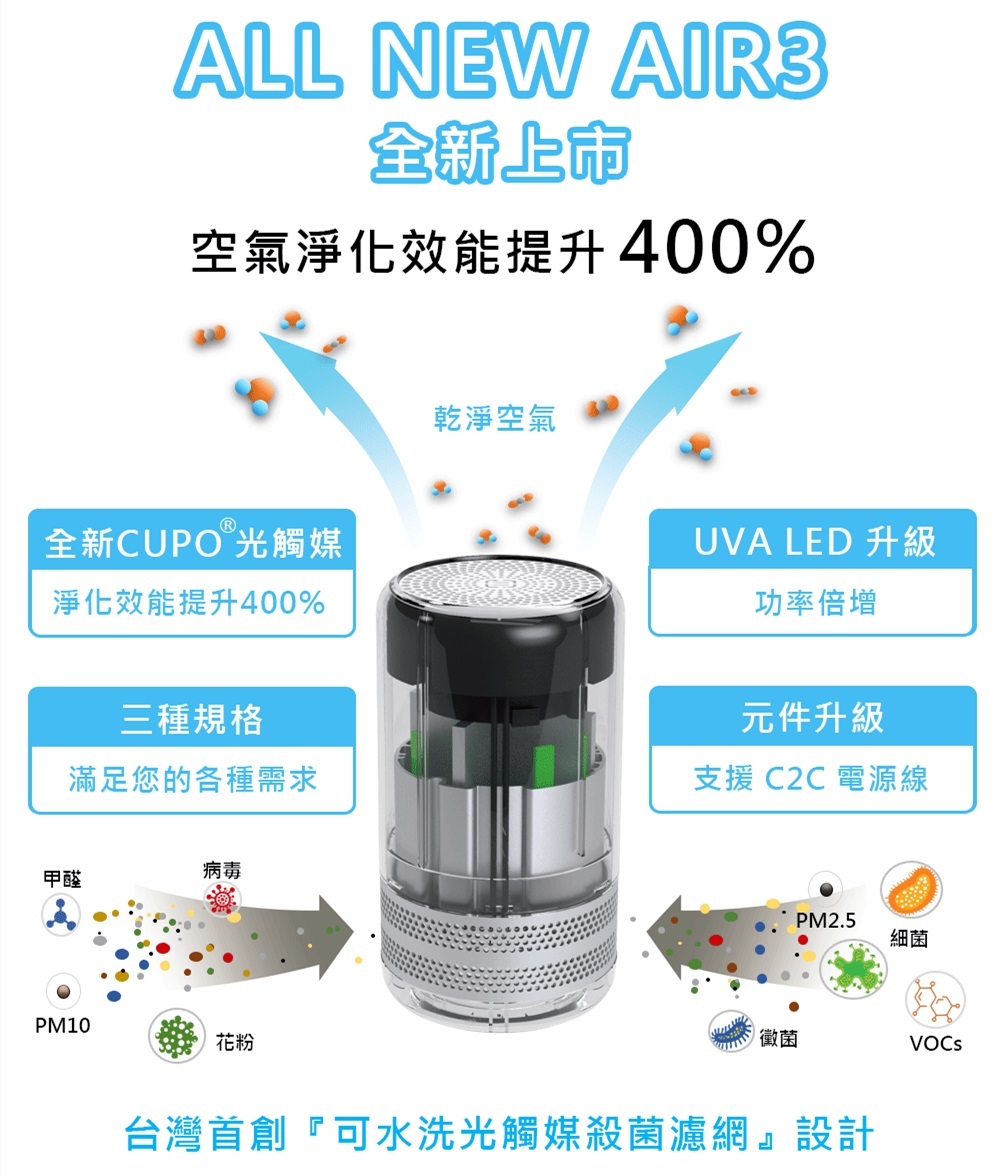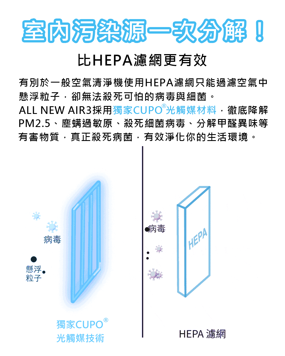 採用獨家CUPO®光觸媒技術去除99.9%冠狀病毒,空氣淨化效能提升400%