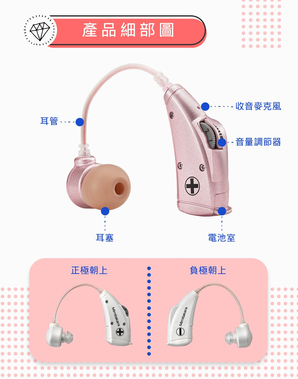 ● 電池規格採用13號鋅空氣電池,全新電池的狀況下約可使用95小時
